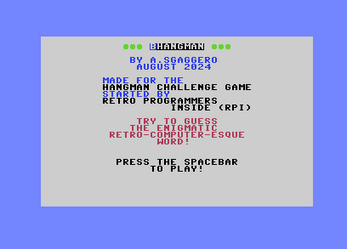 Bhangman64 is a computer version of the popular game Hangman. It was originally programmed by Alberto Sgaggero on the Commodore VIC-20 (to participate in the Hangman Challenge Game promoted by the Facebook group Retro Programmers Inside) and later converted for the Commodore 64.