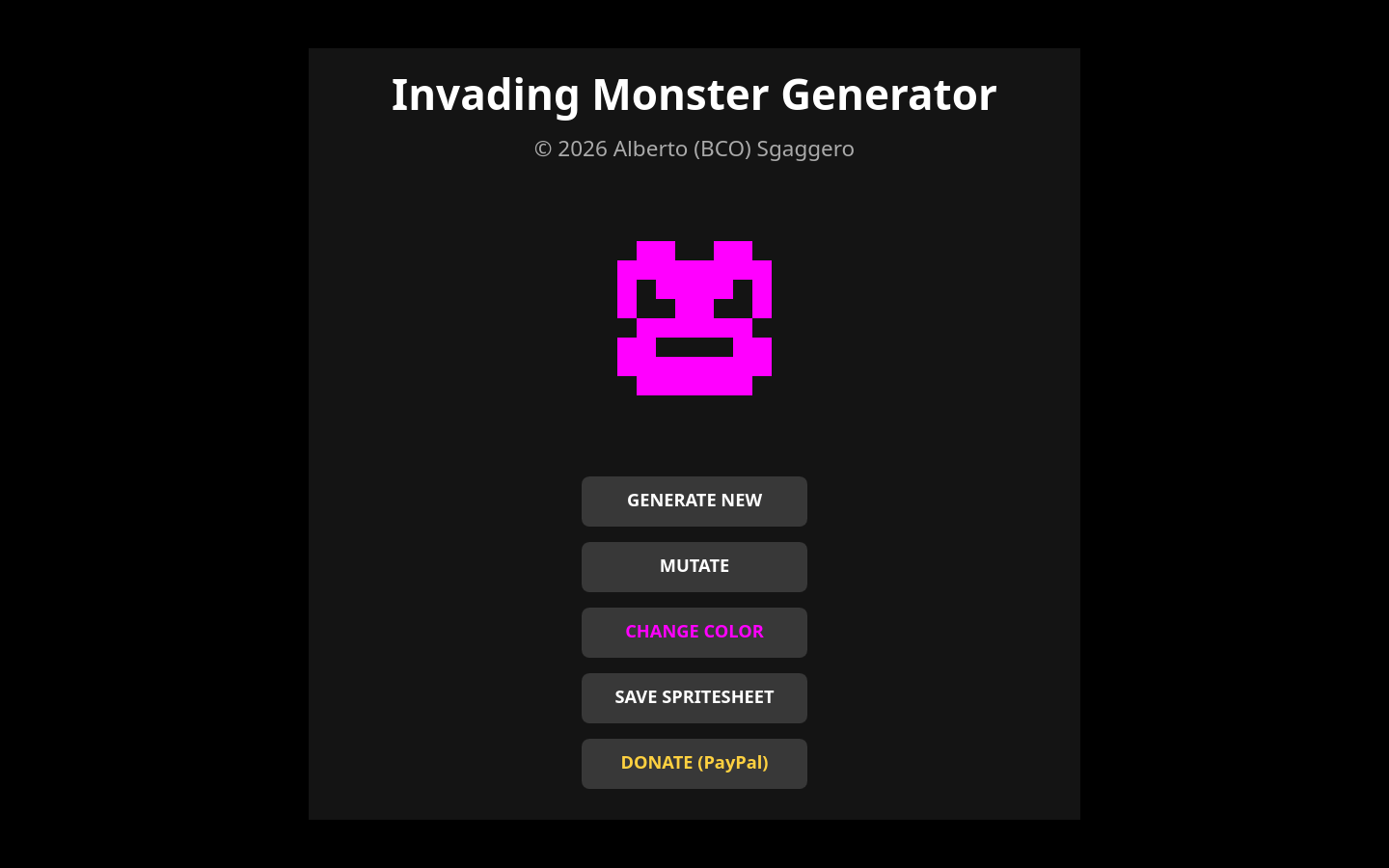 | Tags | 8-Bit, gameassets, gamedev, Generator, Monsters, Pixel Art, Procedural Generation, Retro, spritesheet, tools |